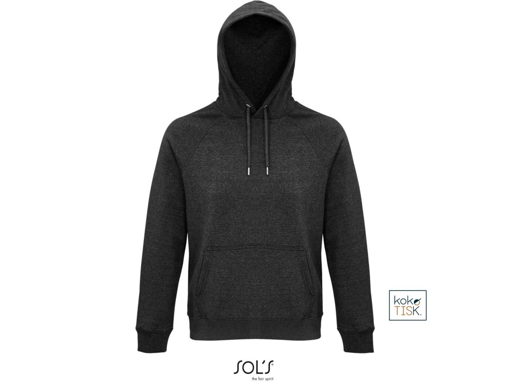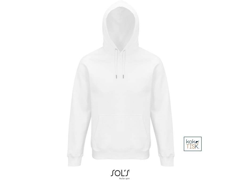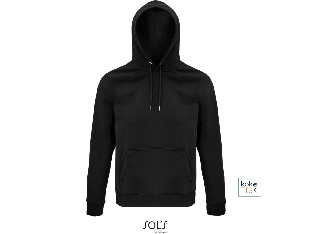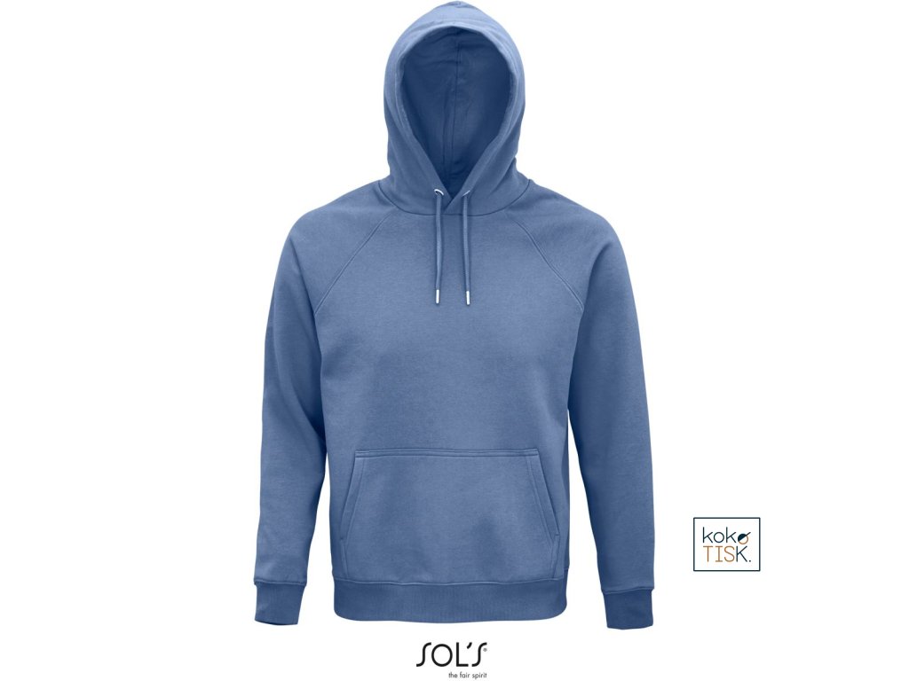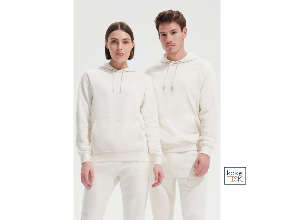 Rovný střih, 2x2 žebrovaný úplet na límci, manžetách a lemu, kapuce s podšívkou z jednoduchého žerzeje, šňůrka tón v tónu, půlměsícová podsádka na krku, krční lemovka, raglánový rukáv, klokaní kapsa, 3-vrstvá kvalitní teplákovina, uvnitř počesaná, pratelné na 40°, nelze sušit v sušičce
