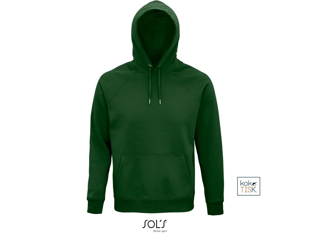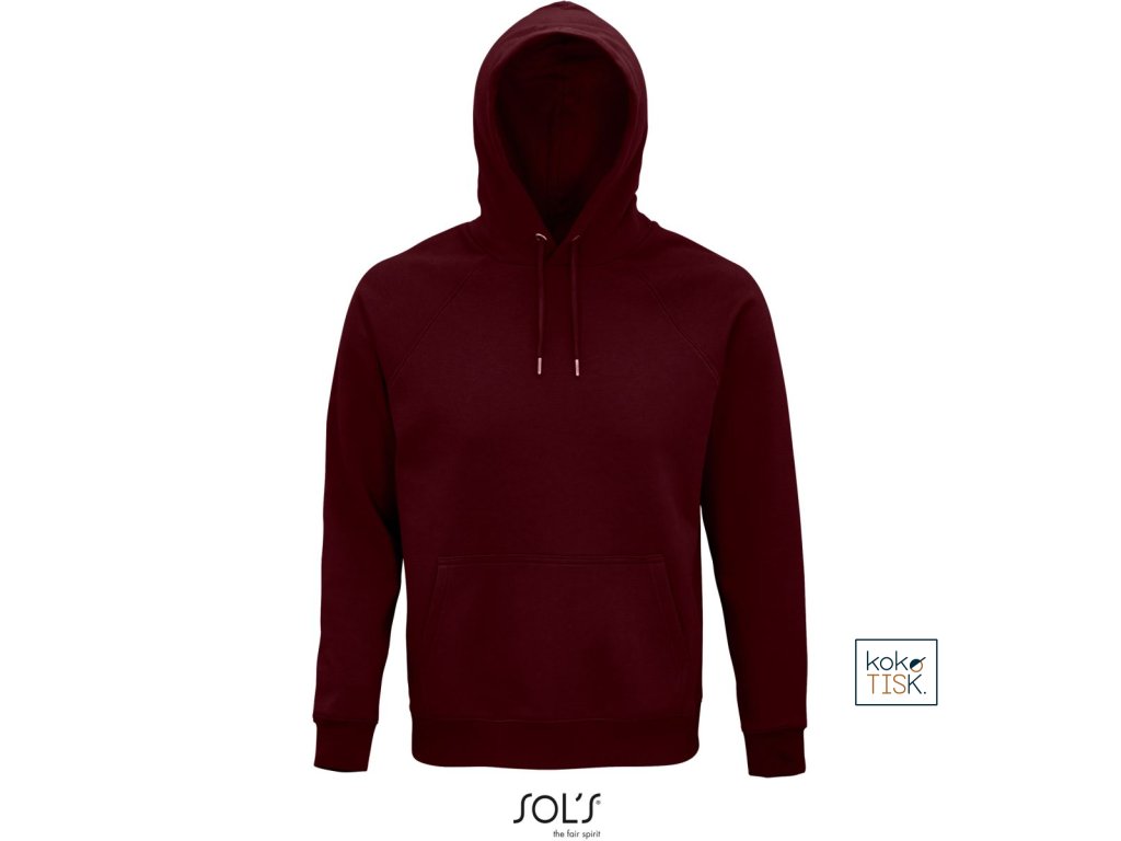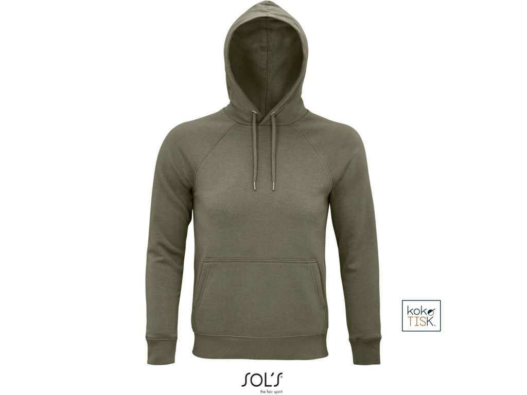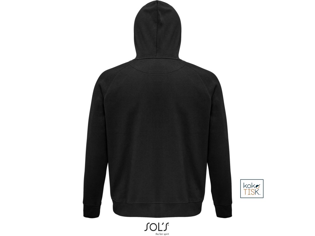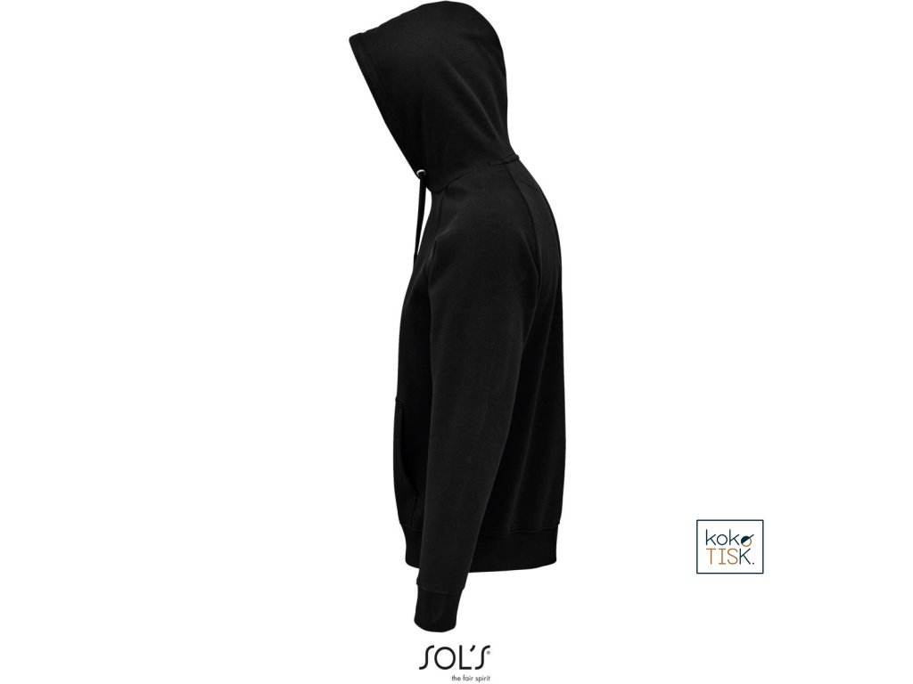 Rovný střih, 2x2 žebrovaný úplet na límci, manžetách a lemu, kapuce s podšívkou z jednoduchého žerzeje, šňůrka tón v tónu, půlměsícová podsádka na krku, krční lemovka, raglánový rukáv, klokaní kapsa, 3-vrstvá kvalitní teplákovina, uvnitř počesaná, pratelné na 40°, nelze sušit v sušičce